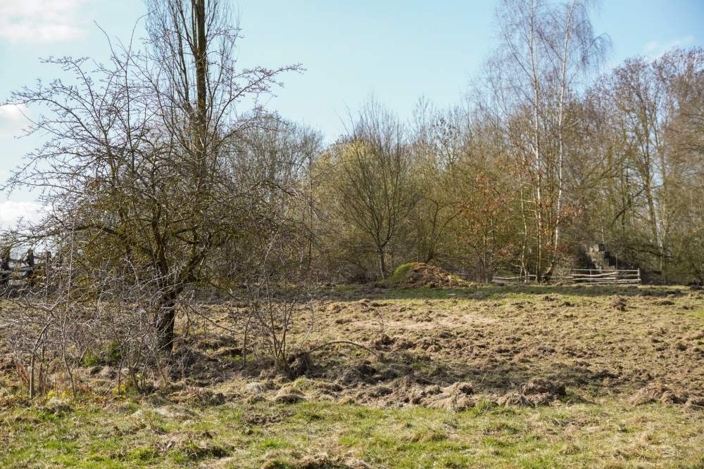 Dort, wo jetzt Hanna, Knut und Rosalie liegen und Anni auf dem Hügel grast, soll es wieder eine leckere Wiese geben. Bisher haben wir immer im Frühjahr einen Bereich für die Schweine unzugänglich abgetrennt, eingesät und dort Wiese wachsen lassen. Dieses Jahr machen wir das Ganze mal anders als sonst, weil eben auch anders ist, als es bisher war. Seit die Wildschweine ihr eigenes Wildschweineland haben, wird im Schweineland weniger großflächig gewühlt. Also probieren wir mal, dort ohne Abtrennung eine schicke, leckere Wiese wachsen zu lassen.