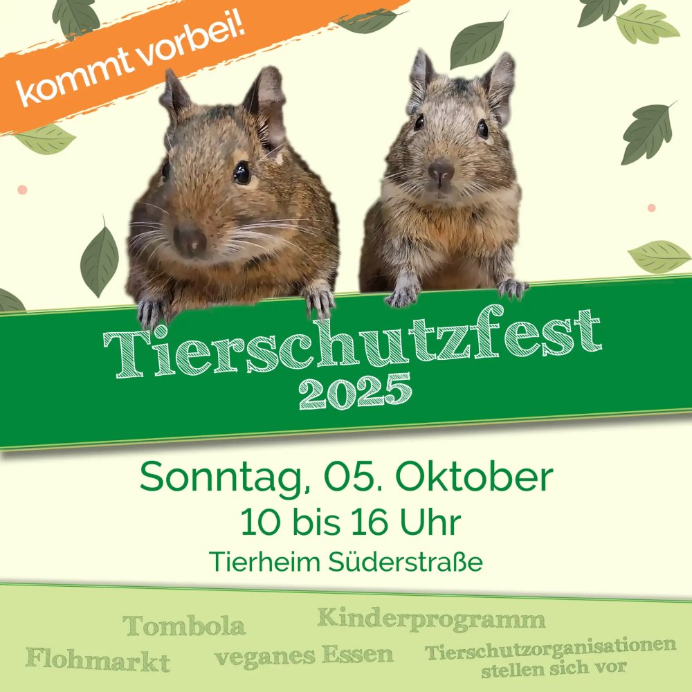 Am Sonntag, den 5.10., kommt das Land der Tiere nach Hamburg und zwar zum Tierschutzfest des Hamburger Tierschutzverein von 1841 e. V.! Von 10-16 Uhr erwartet euch im Tierheim Süderstraße ein buntes Programm mit Tombola, Flohmarkt, veganem Essen und Info-Ständen. Wir sind auch dabei. Kommt rum und lernt uns und die Geschichten der geretteten Tiere aus dem Land der Tiere kennen!