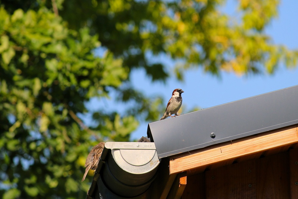 Die Spatzen im Land der Tiere haben gleich den vollen Service gebucht, denn neben viel Natur mit unfassbar vielen Bäumen und Sträuchern gibt es in und an den vielen Gebäuden reichlich Möglichkeiten, Nester zu bauen. Und diverse Futterstellen im Land sind selbstverständlich immer gefüllt. Gemessen an den Körnermengen, die sie verdrücken, haben die Spatzen noch ganz schön viel vor im Land der Tiere.
