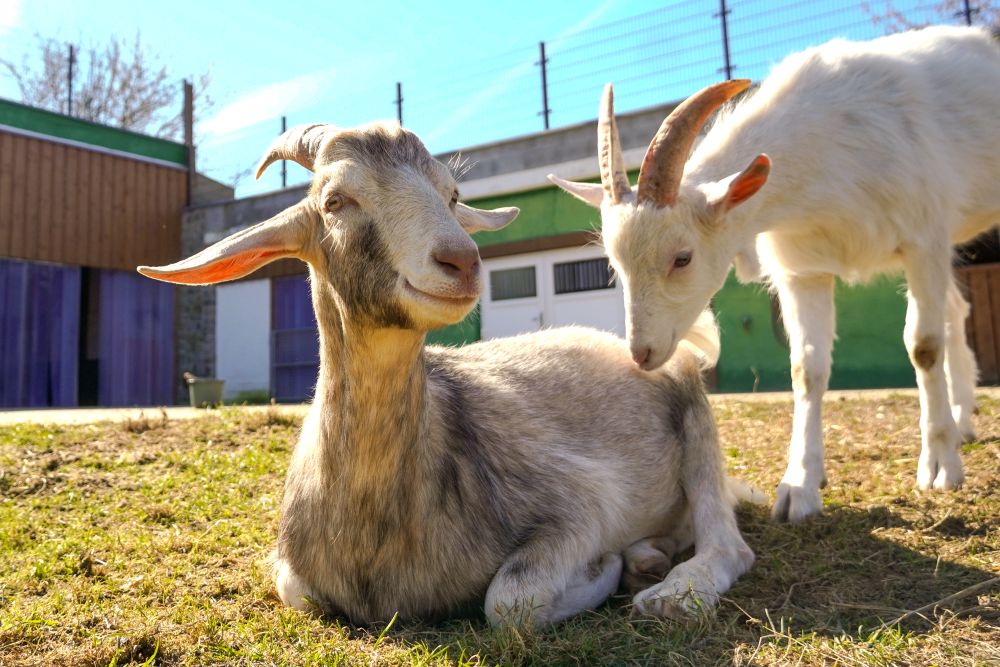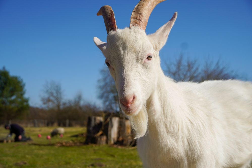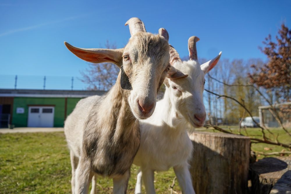 Die ersten Ziegen im Land lebten noch zusammen mit den Schafen. Da Ziegen, vor allem diejenigen mit Hörnern, allerdings jede Menge „Quatsch machen“, bekamen sie ihren eigenen Bereich und wohnen heute in und um Stall #3, der sogar für sie begehbar ist und perfekte Aussicht übers Land bietet. Die Ziegenställe stehen immer offen, so dass sie auf ihrem Areal tun und lassen können, was sie mögen.